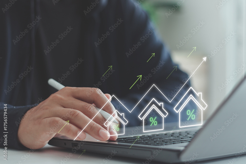 Businessman analyzing real estate investment growth on laptop with virtual house icons and rising graph. Concept of property market, mortgage rate, housing finance and financial planning strategy.