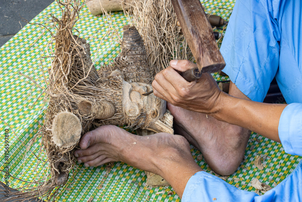 Close-Up of artisan when carving a decorative sculpture, Vietnam