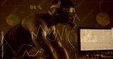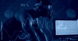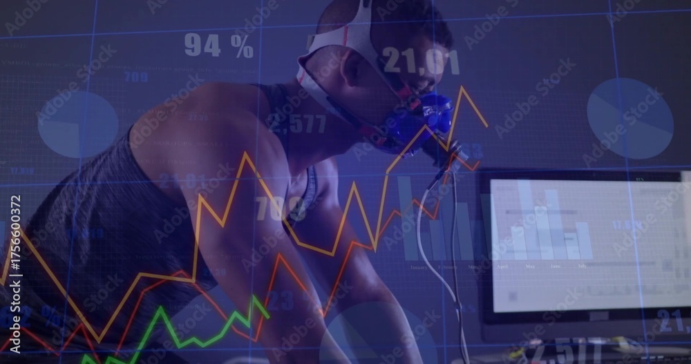 Pedaling male wearing gas analysis mask on stationary bike in science lab, with computer charts
