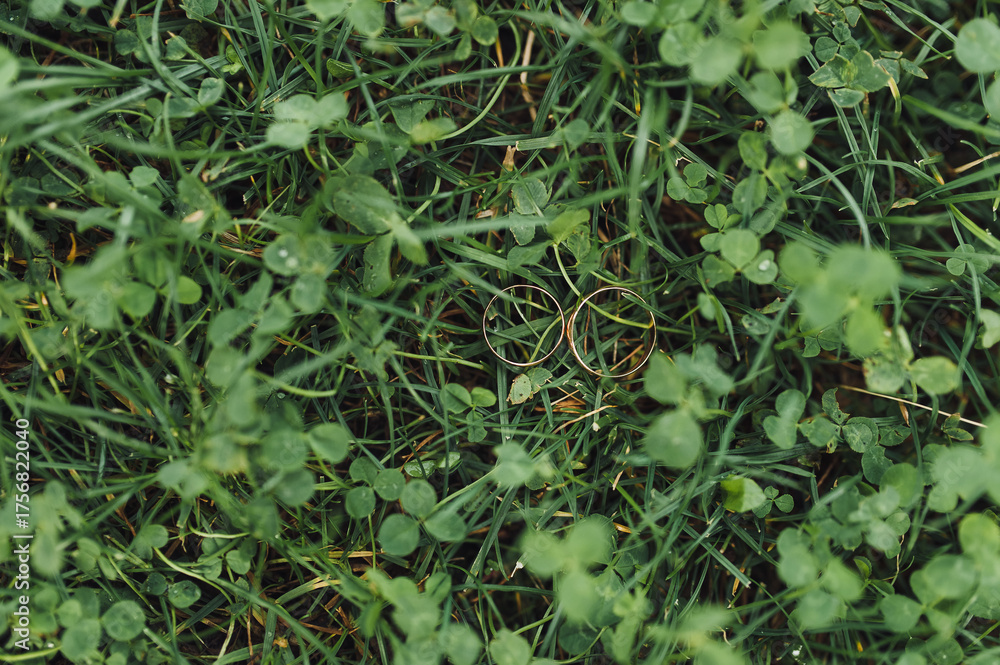 Two gold rings lie on green grass. Wedding accessories concept.