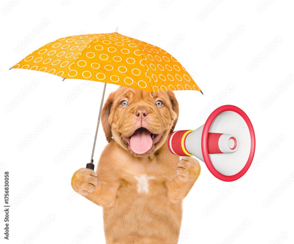 Happy Mastiff puppy holding umbrella and barking into a megaphone. isolated on white background