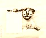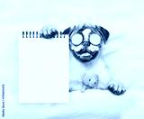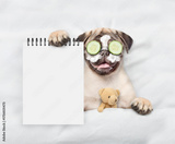 Funny Pug puppy with pieces of cucumber and cream on it eyes relaxing on the bed at home with toy bear and showing blank notepad. Top down view. Empty space for text