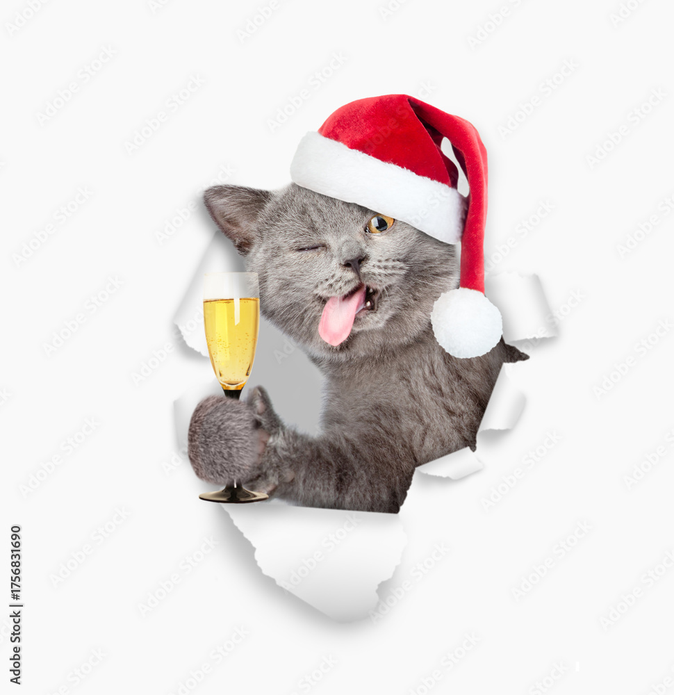 Winking cat with tongue out wearing red santa hat looking through a hole in white paper and holding glass of champagne