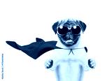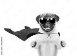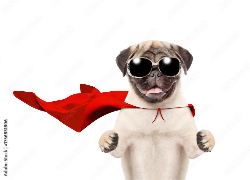 Funny Pug puppy wearing sunglasses and superhero costume looking at camera. Isolated on white background