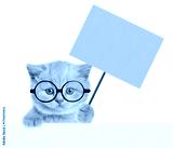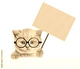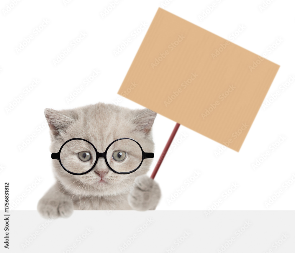 Funny tiny smart kitten wearing eyeglasses shows blank placard above blank white banner. Empty space for text. isolated on white background
