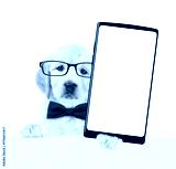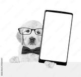 Funnysmart Golden Retriever puppy wearing eyeglasses and tie bow looks above blank white banner and shows big smartphone with blank screen in it paw. Empty space for text. isolated on white background