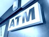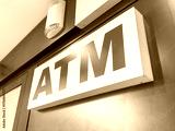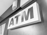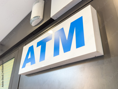 ATM sign illuminated in bright blue letters against a modern wall, showcasing banking technology and accessibility for customers in urban environments
