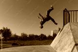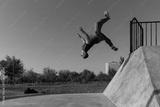 Male freerunner performs a backflip off a sloped concrete wall in an outdoor park, captured midair with extended limbs under clear skies, showcasing athletic precision and agility