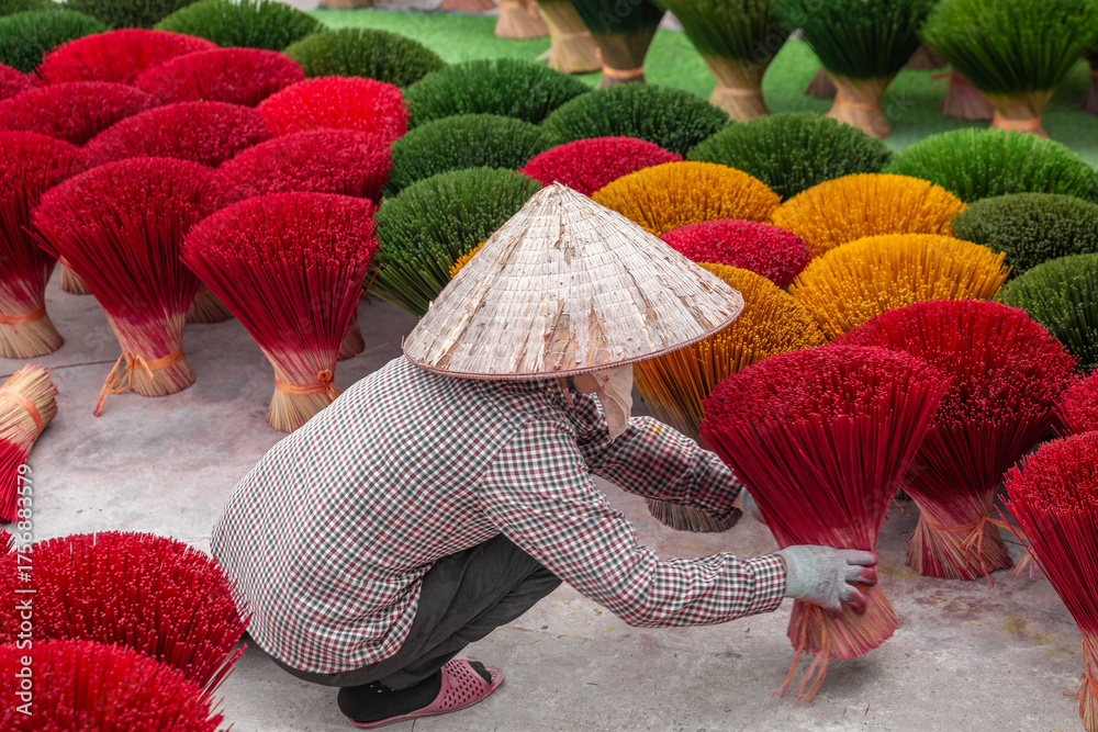 A worker wearing a traditional conical hat arranges vibrant bundles of red, yellow, and green incense sticks at an artisan workshop in Vietnam. This traditional craft showcases manual production and