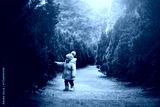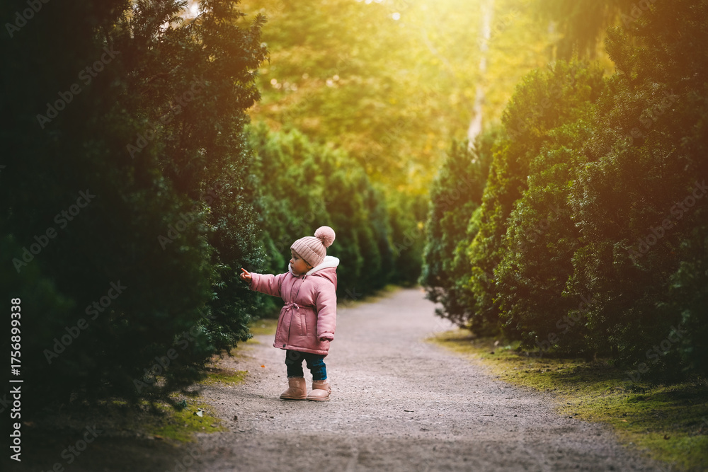 A beautiful little girl in pink warm clothes is walking in a park at sunset.
