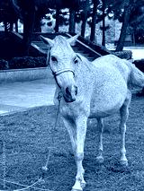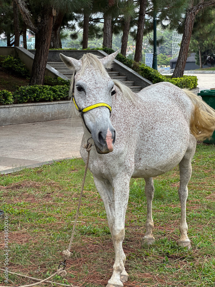 A speckled white horse with a bright yellow halter stands on a grassy patch in a park, with pine trees and concrete stairs in the background of Da Lat, Vietnam.