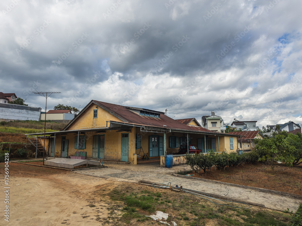 A rustic, colonial-style yellow house with a weathered red roof under a dramatic cloudy expanse in a tranquil hillside residential area, possibly Da Lat, Vietnam. Capturing rustic charm and daily