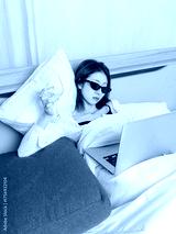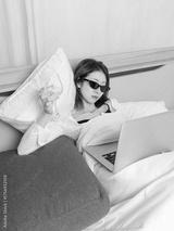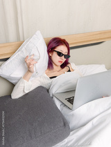 Asian young woman with purple hair wearing sunglasses, holding wine glasses using laptop computer lying under white blanket in bed, concept lazy weekend relaxation comfort zone home lifestyle leisure.