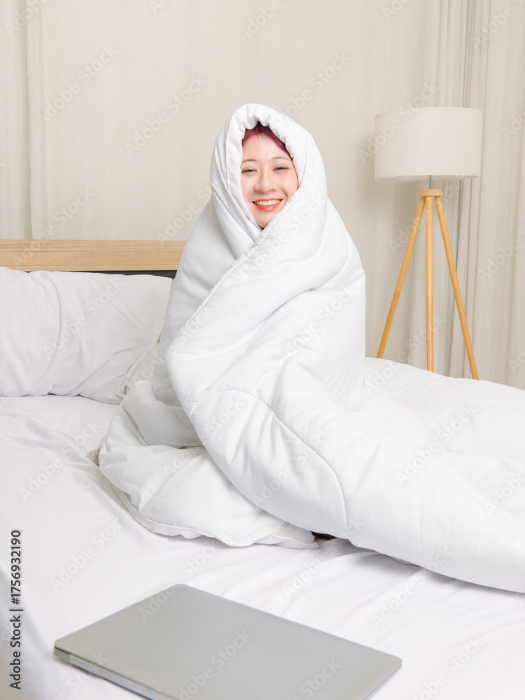 Asian young pretty woman with purple hair wrapped sitting under blanket on white bed with laptop computer look at camera concept lazy weekend remote work relaxation comfort zone home lifestyle leisure
