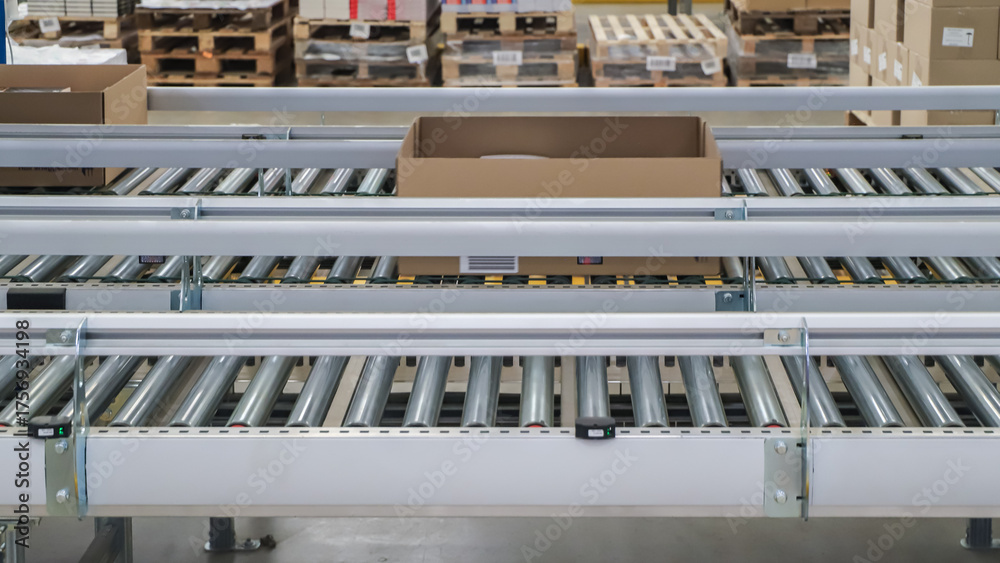 packing line in a logistics warehouse. conveyor belt in a modern production line