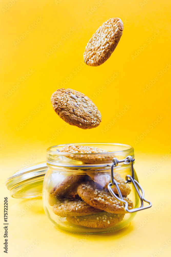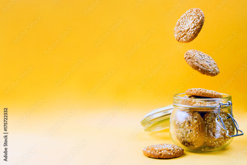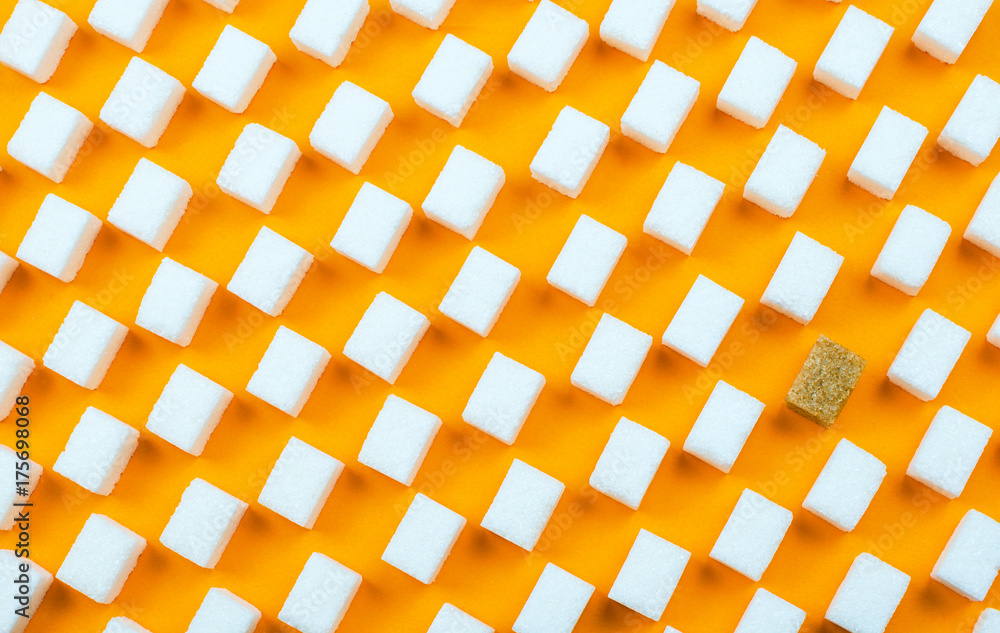 White sugar cubes with one brown sugar cubes on orange background. Flat lay.
