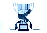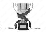Golden trophy cup with red ribbon isolated PNG, award prize for winner and champion on transparent background, victory achievement concept