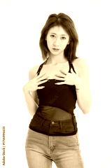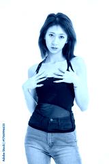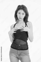 Asian pretty confident young woman purple hair standing posing wearing black sleeveless top blue jeans on white background in studio modern street outfit fashion portrait casual attitude trendy style.