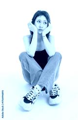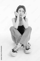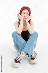 Asian pretty confident young woman purple hair sitting posing wearing black sleeveless top blue jeans on white background in studio modern street outfit fashion portrait casual attitude trendy style.