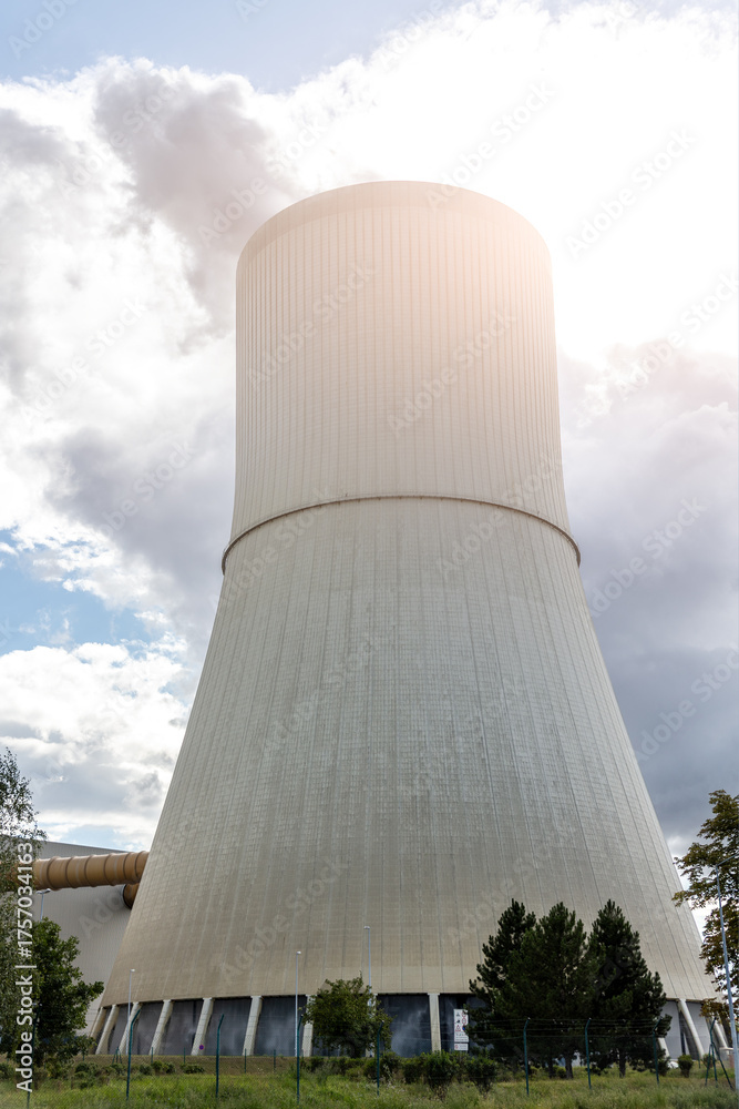 Tall cooling tower releasing steam into blue sky, symbol industrial energy production and technology. The structure represents power generation, heat emission and environmental engineering in Germany