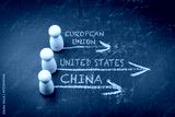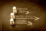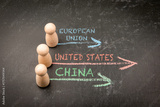 Concept of global relations with wooden figures standing by chalk arrows labeled European Union United States and China on blackboard symbolizing international cooperation and competition