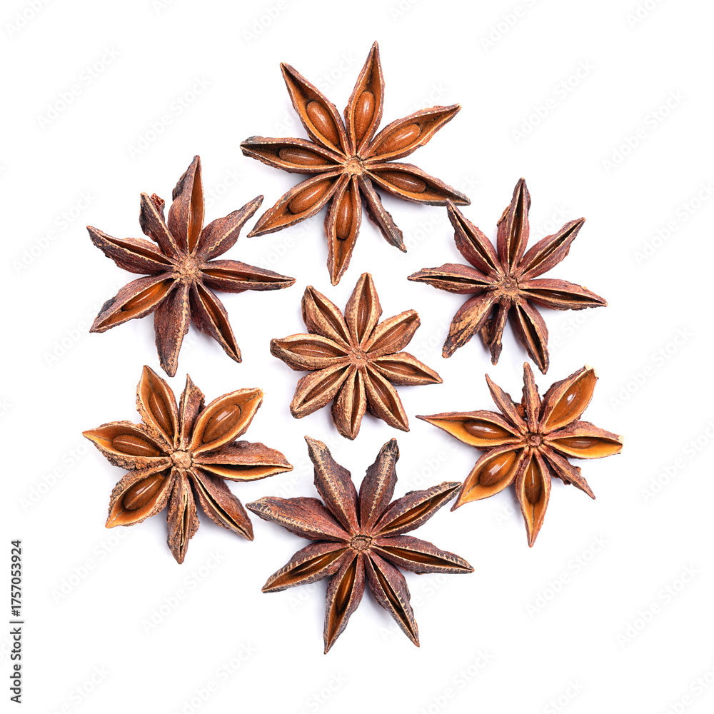 Star anise, circle on white background. Star shaped fruits and seeds of Illicium verum, also known as badian, and as star aniseed, a spice that closely resembles anise in flavor. Close-up, from above.