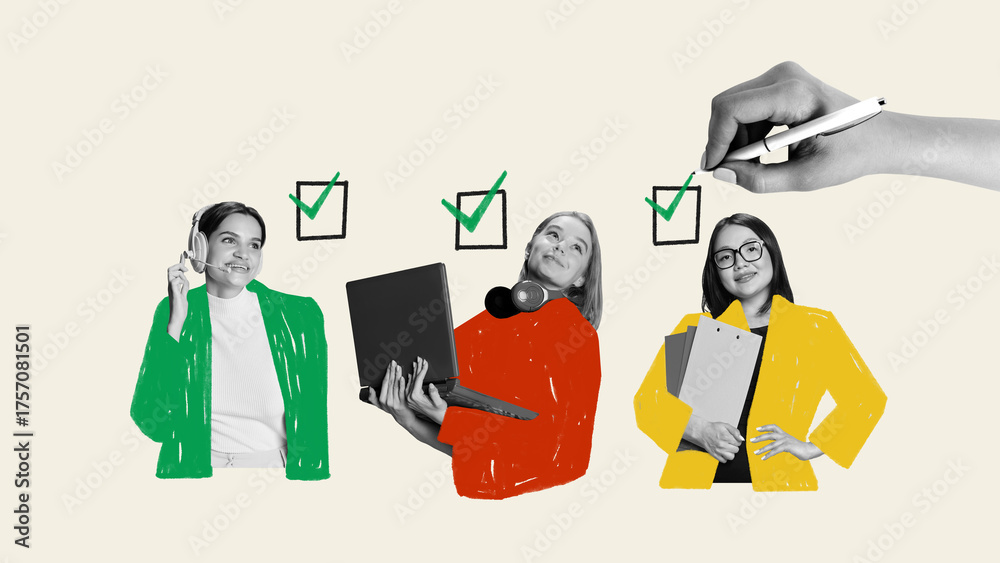 Colorful collage. Hand checking marks above three successful women with laptops and documents. Concept of career achievement, professional performance, and business teamwork.