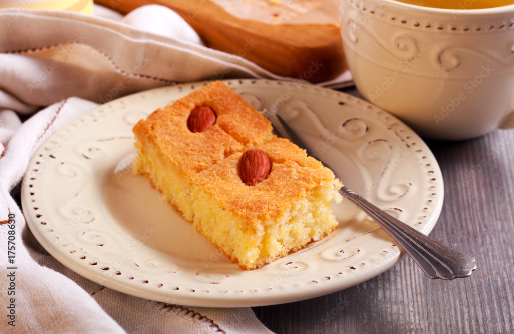 Basbousa - traditional Middle Eastern sweet cake with almond
