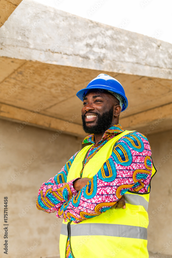 Portrait of Confident African construction engineer in safety vest and hard hat smiling at building site