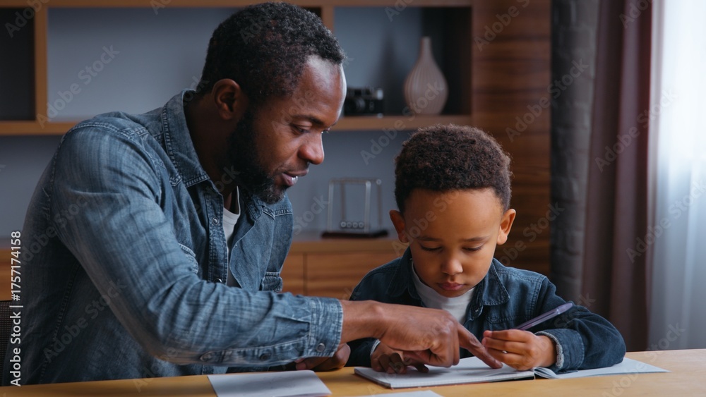 African American family clever father help son writing letters write homework man teacher tutor teaching little ethnic boy kid child pupil preparing to school dad distant busy elementary education