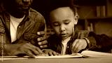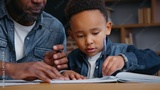African American family concentrate child with father study at home writing notes homework exercises language learning preschool learn dad educator tutor with little son pupil boy kid write homework