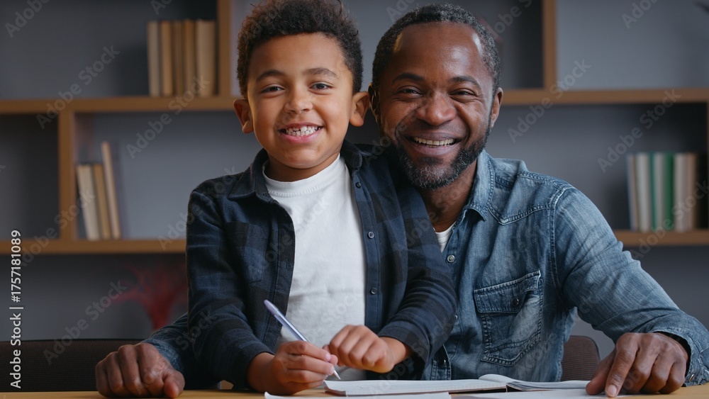 African American family smiling portrait study looking at camera ethnic father dad with little son kid child boy studying learning at table writing homework distant education video call positive look