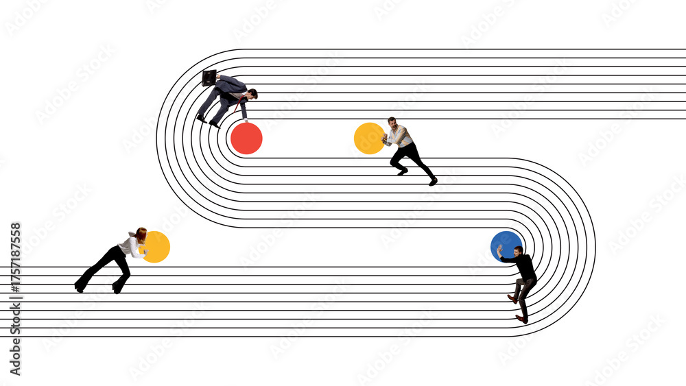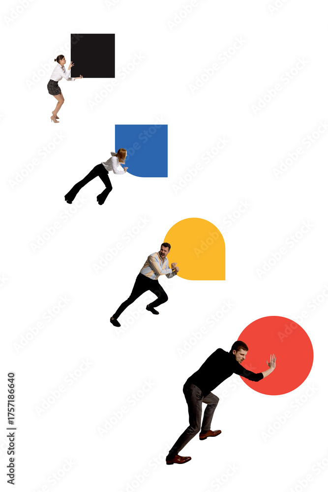 Trendy collage. Business team pushing colorful geometric forms symbolizing growth and cooperation. Concept of teamwork, collaboration for strategy visuals, HR materials, and startup presentations.