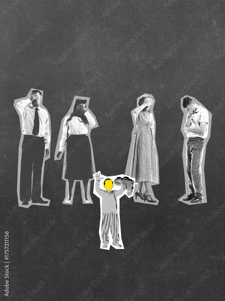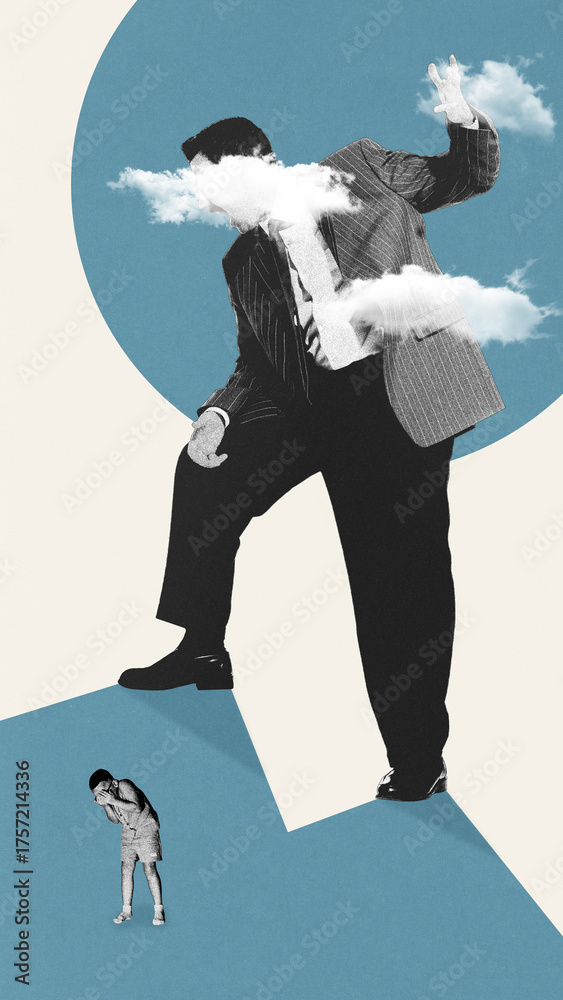 Graphic composition. Giant businessman towering above small child expressing fear and oppression. Concept of authority pressure, , emotional trauma, education, and social justice campaigns.