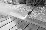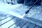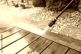 cleaning terrace with a power washer - high water pressure cleaner on wooden terrace surface
