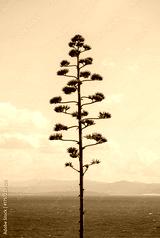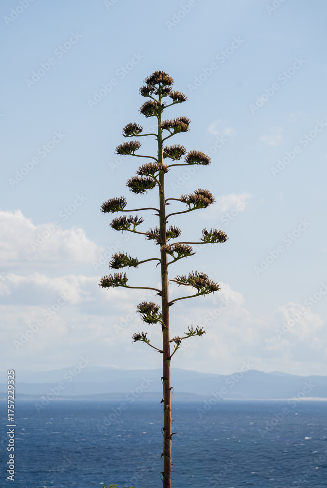 Tall agave flower stalk rising against the sea horizon and sky, symbolizing Mediterranean nature