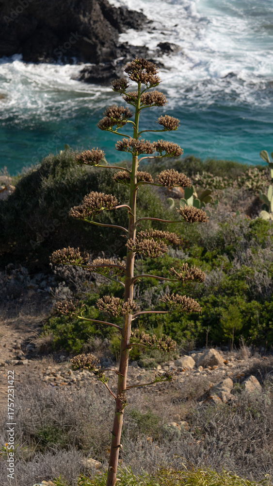 Tall agave flower stalk rising against the sea horizon and sky, symbolizing Mediterranean nature