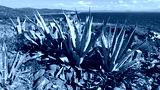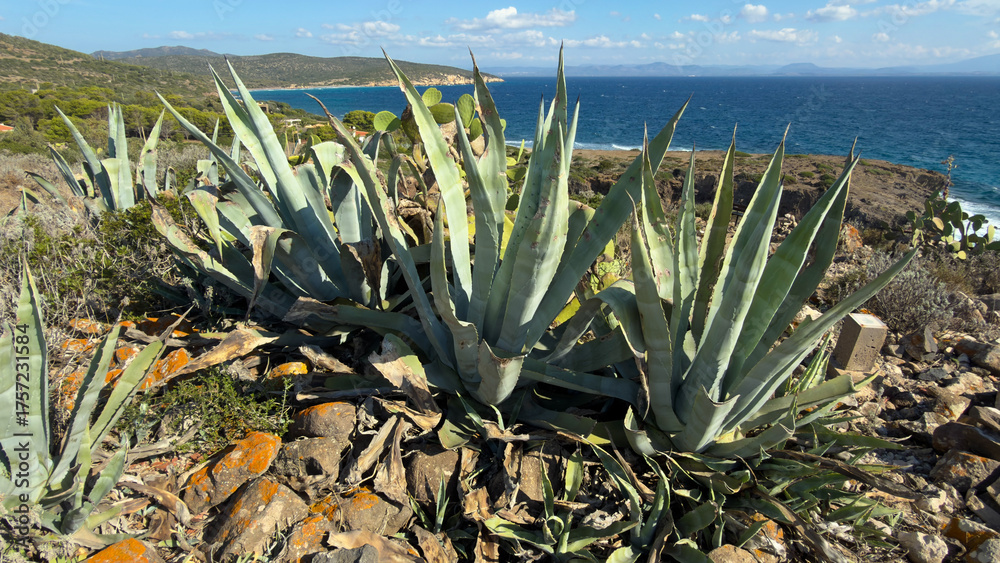 Large agave succulents growing on rocky cliffs overlooking the blue Mediterranean Sea under a bright sky