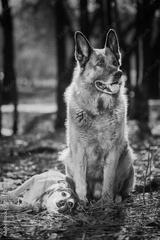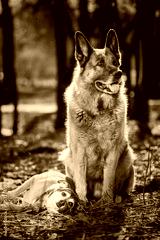 Alsatian Wolf Dog Or Black German Shepherd Dog Sit On Dry Grass In Autumn Forest. Deutscher Dog. Playful Pet Outdoors. Happy Pets Concept. Close-Up View