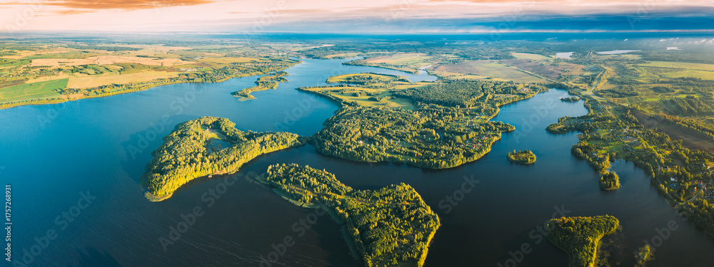 Lyepyel, Lepel Lake, Beloozerny District, Vitebsk Region. Aerial View Of Lyepyel Cityscape Skyline In Autumn Morning. Morning Fog Above Lepel Lake. Top View Of European Nature From High Attitude In