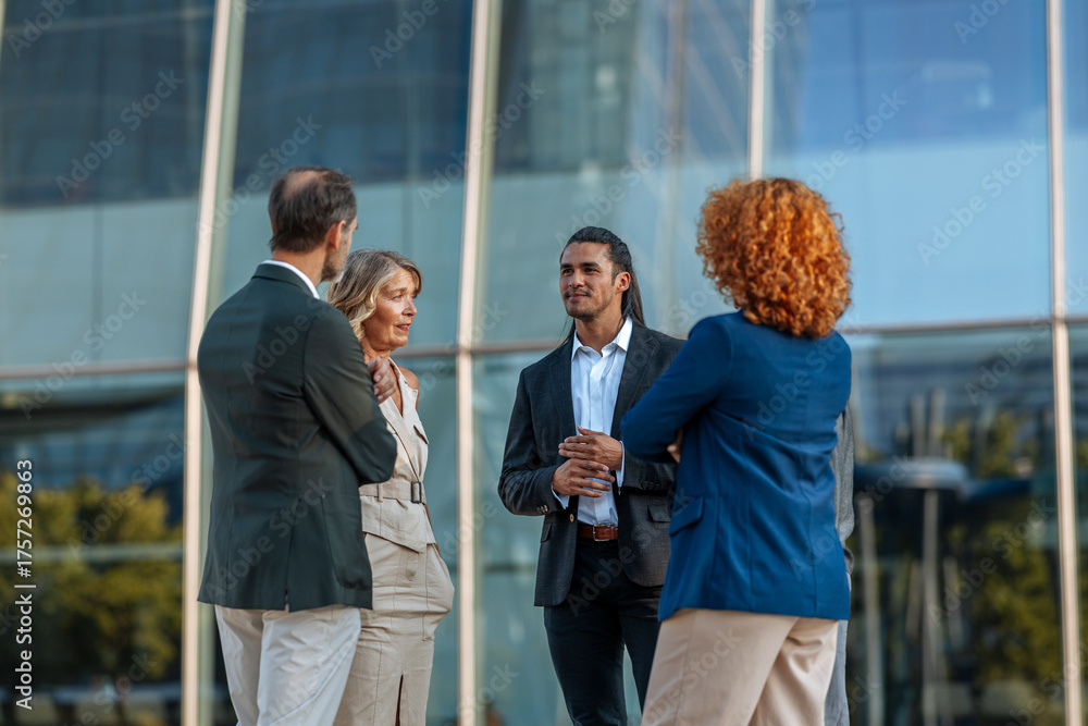 Professional Group Conversation Outside Modern Glass Building for a Business Meeting