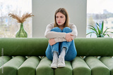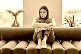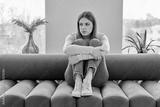 Unhappy upset young woman sitting on sofa at home, face close-up