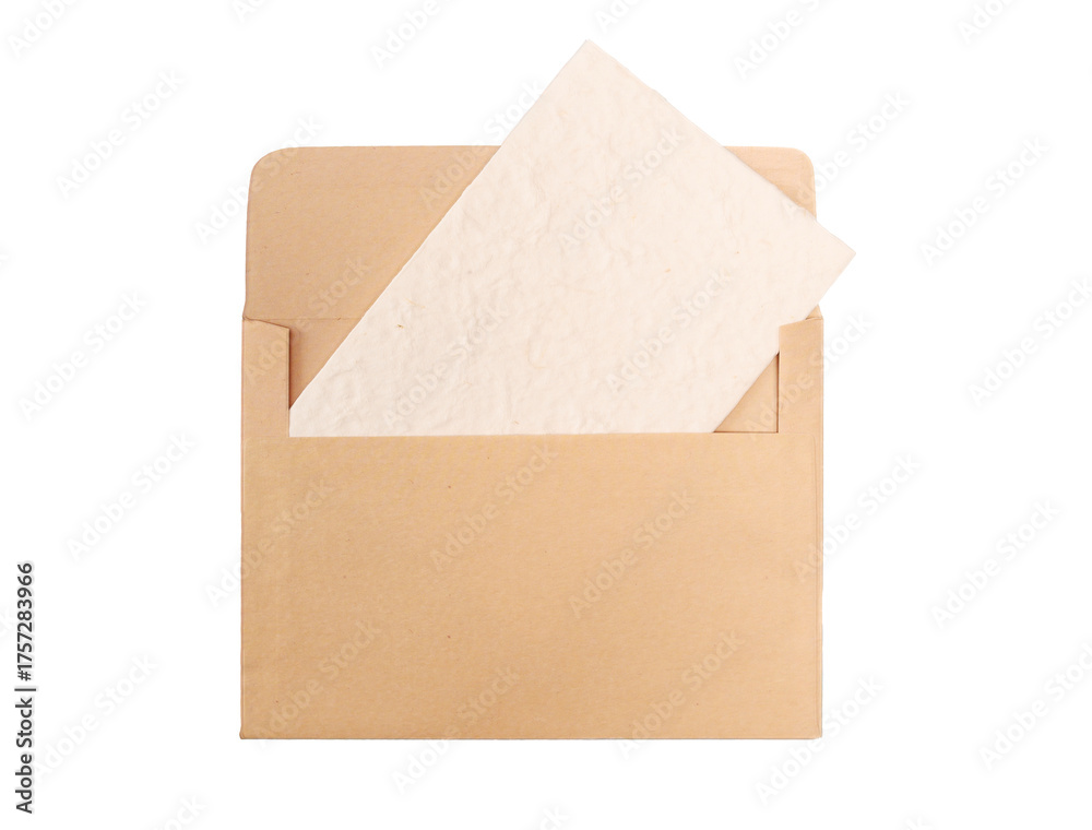 Brown kraft envelope mockup presenting blank textured paper card for a personalized message, transparent background