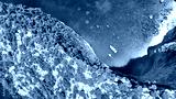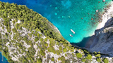 Aerial drone photo of famous steep rocky white cliffs creating beautiful coves and turquiose sea caves of Kampi visited by small boats and yachts in northern part of Zakinthos island, Ionian, Greece