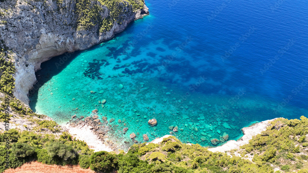 Aerial drone photo of famous caves of Agalas a popular yacht and sail boat place with white steep volcanic rocks and turquoise crystal clear sea, Zakynthos island, Ionian, Greece