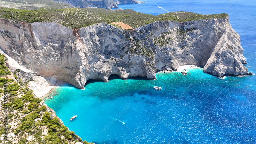 Aerial drone photo of famous caves of Agalas a popular yacht and sail boat place with white steep volcanic rocks and turquoise crystal clear sea, Zakynthos island, Ionian, Greece
