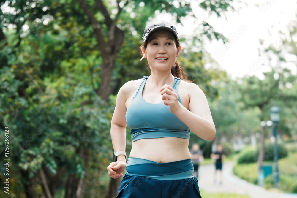 Middle-aged woman jogging in a park with greenery around