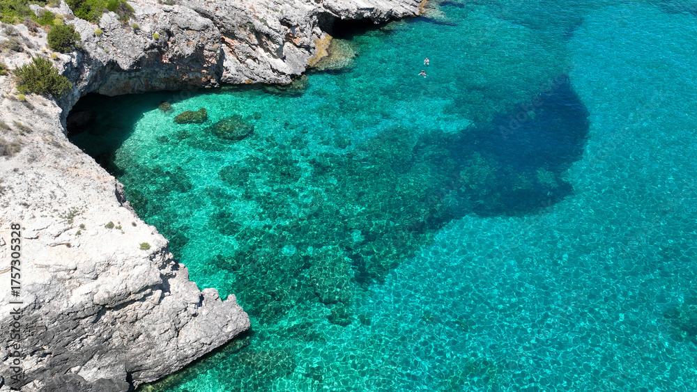 Aerial drone photo of famous for sulphur and small coves and caves beach of Xigia in northern part of Zakinthos island, Ionian Sea, Greece