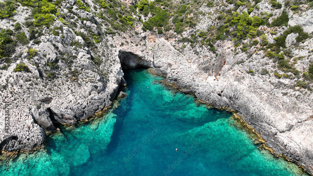 Aerial drone photo of tropical Caribbean island fjord shaped paradise bay with white rock arch caves and turquoise clear sea