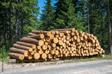 Large stack of cut timber logs beside forest road, raw wood trunks piled high in conifer woodland, forestry industry and natural resource background on sunny day